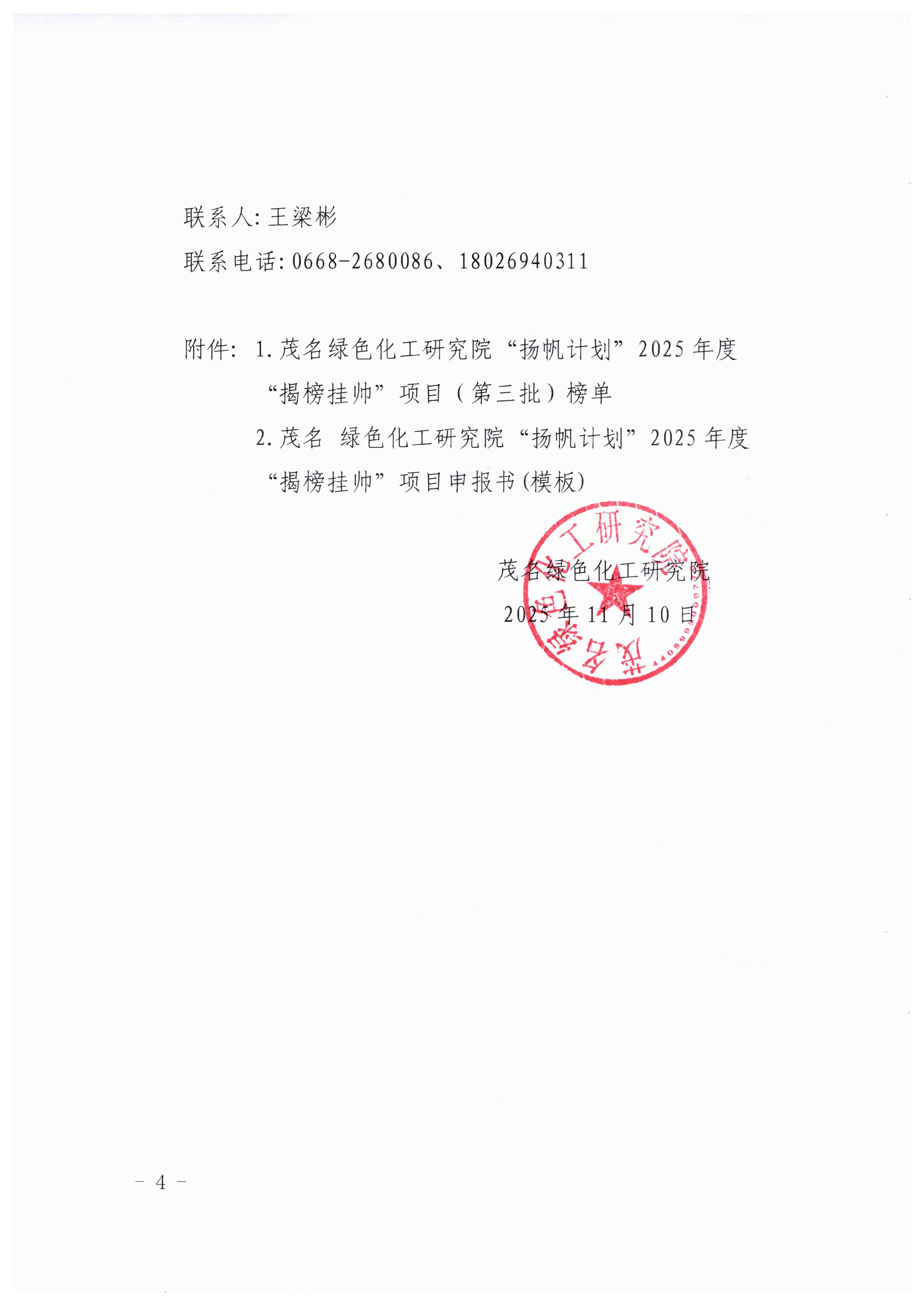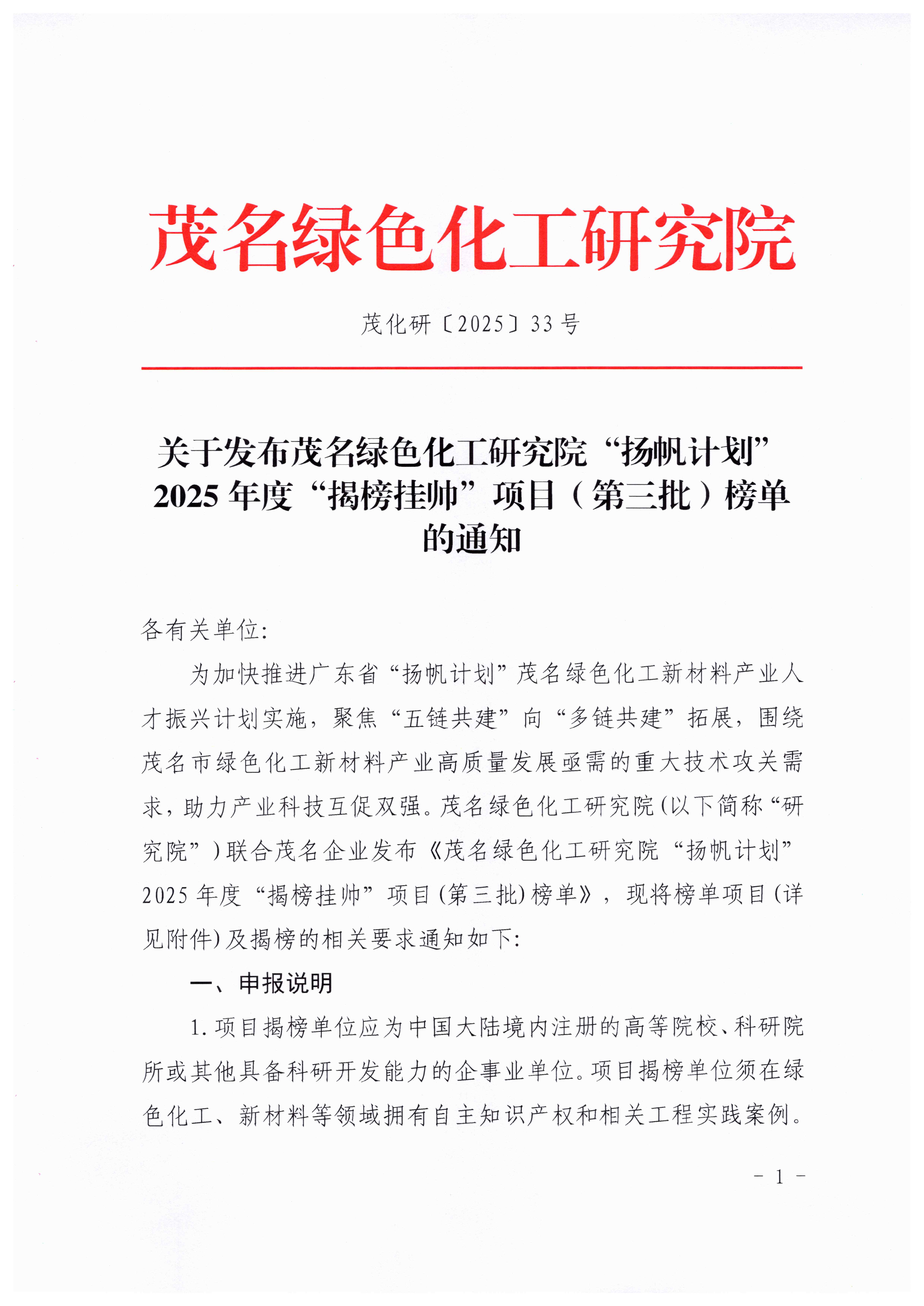 关于发布茂名绿色化工研究院“扬帆计划”2025年度“揭榜挂帅“(第三批)榜单的通知(茂化研〔2025〕33号).pdf