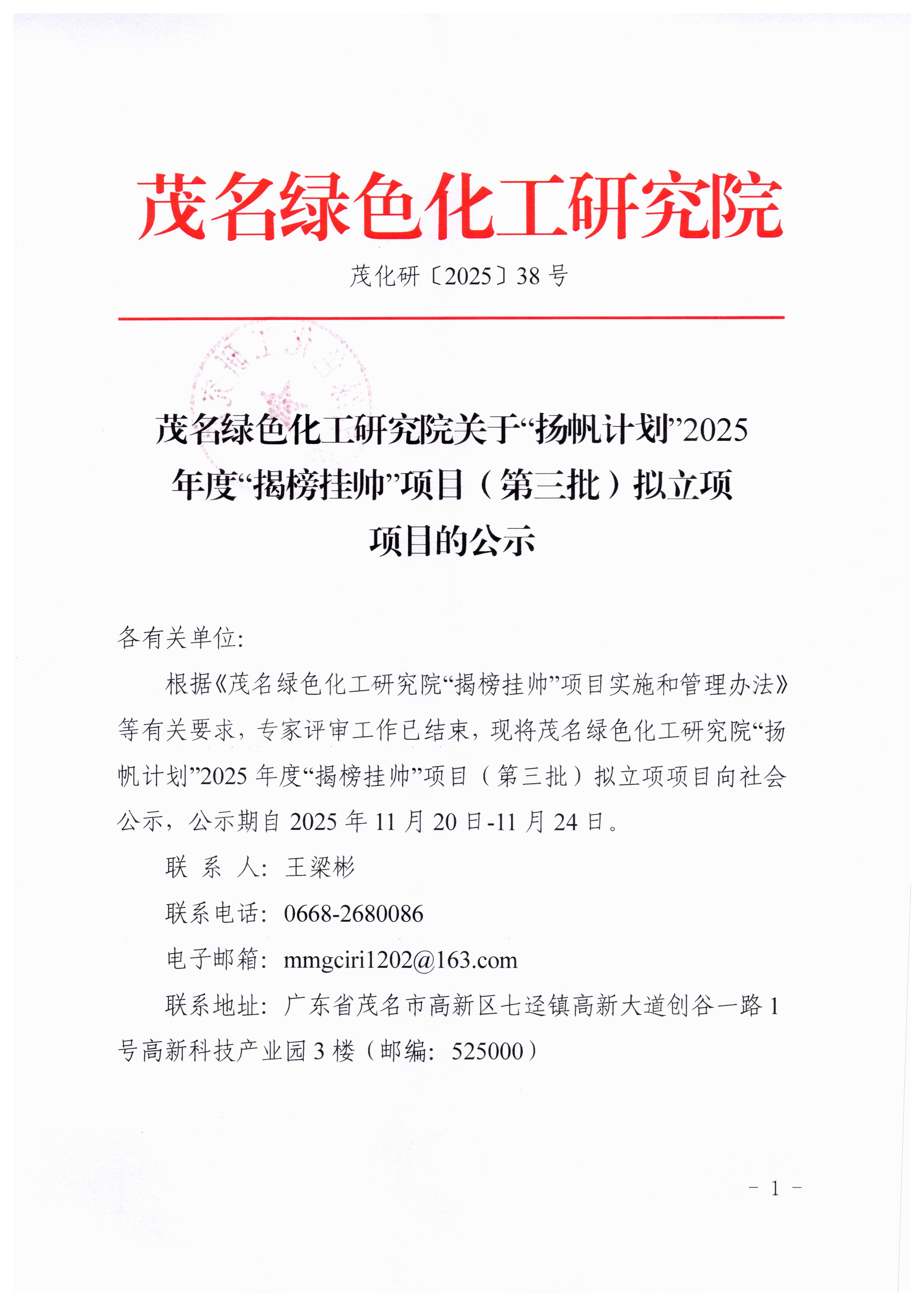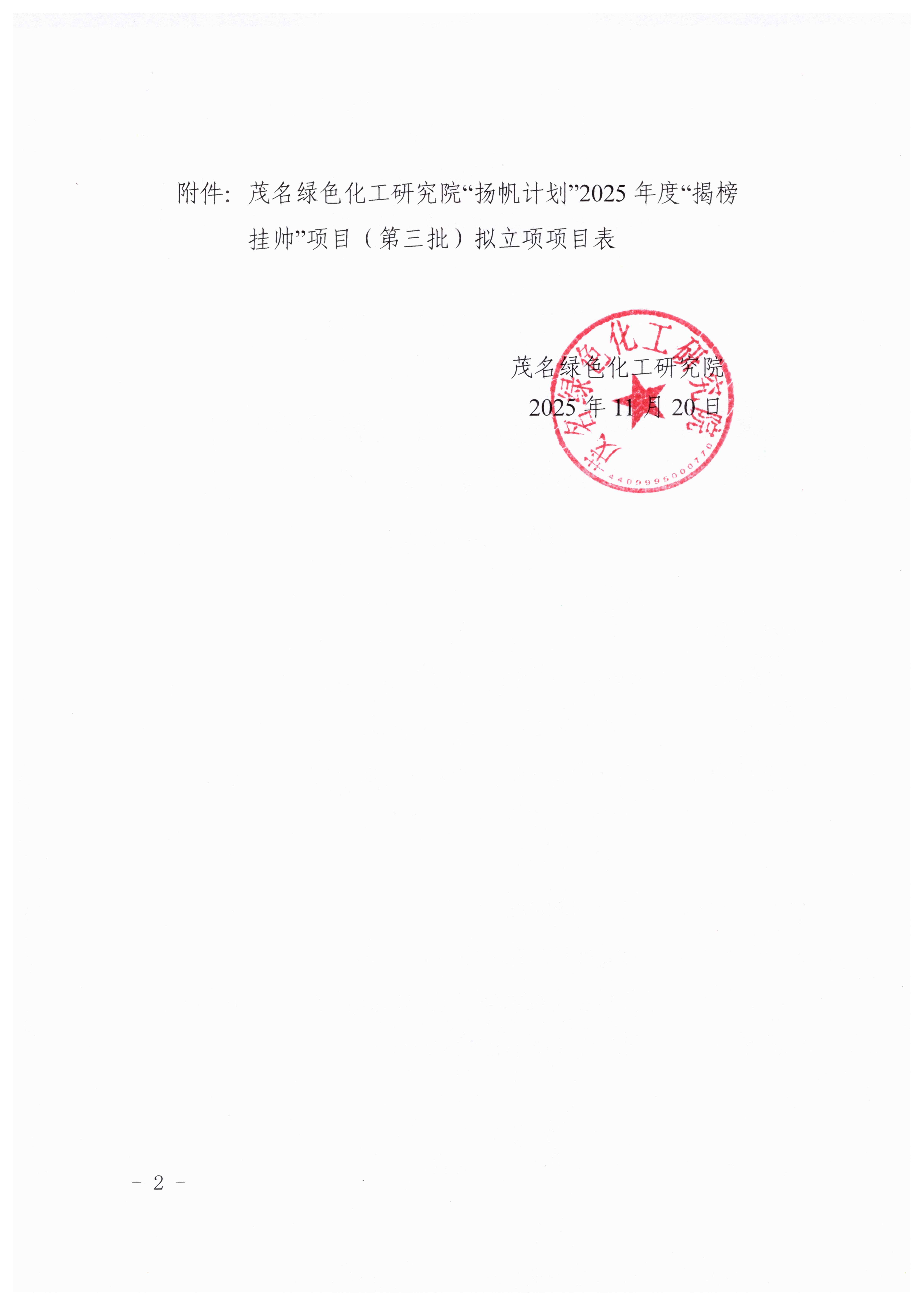 茂名绿色化工研究院关于“扬帆计划”2025年度“揭榜挂帅”项目(第三批)拟立项项目的公示